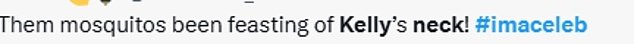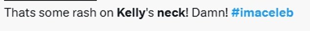 While Kelly was talking in the Bush Telegraph, as well as chatting to Vogue Williams, 40, and Lisa, 49, about her role as camp chef, some red marks were very visible on her neckline above her t-shirt.