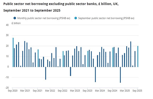 Analysts had pencilled in £20.8billion of borrowing in September, but the Treasury’s OBR watchdog forecast a lower level of £20.1billion.