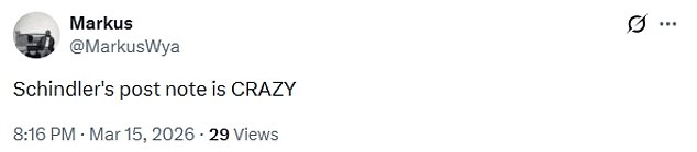 He added: ‘Schindler’s Post-It’ to the end of his list.