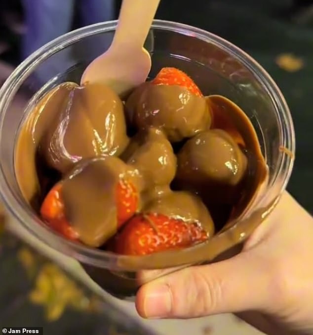 She popped out into the capital’s bustling streets during a break in a performance of Harry Potter and the Cursed Child at a nearby theatre and spotted a seasonal stall selling fruit, marshmallows and other treats dipped in chocolate.