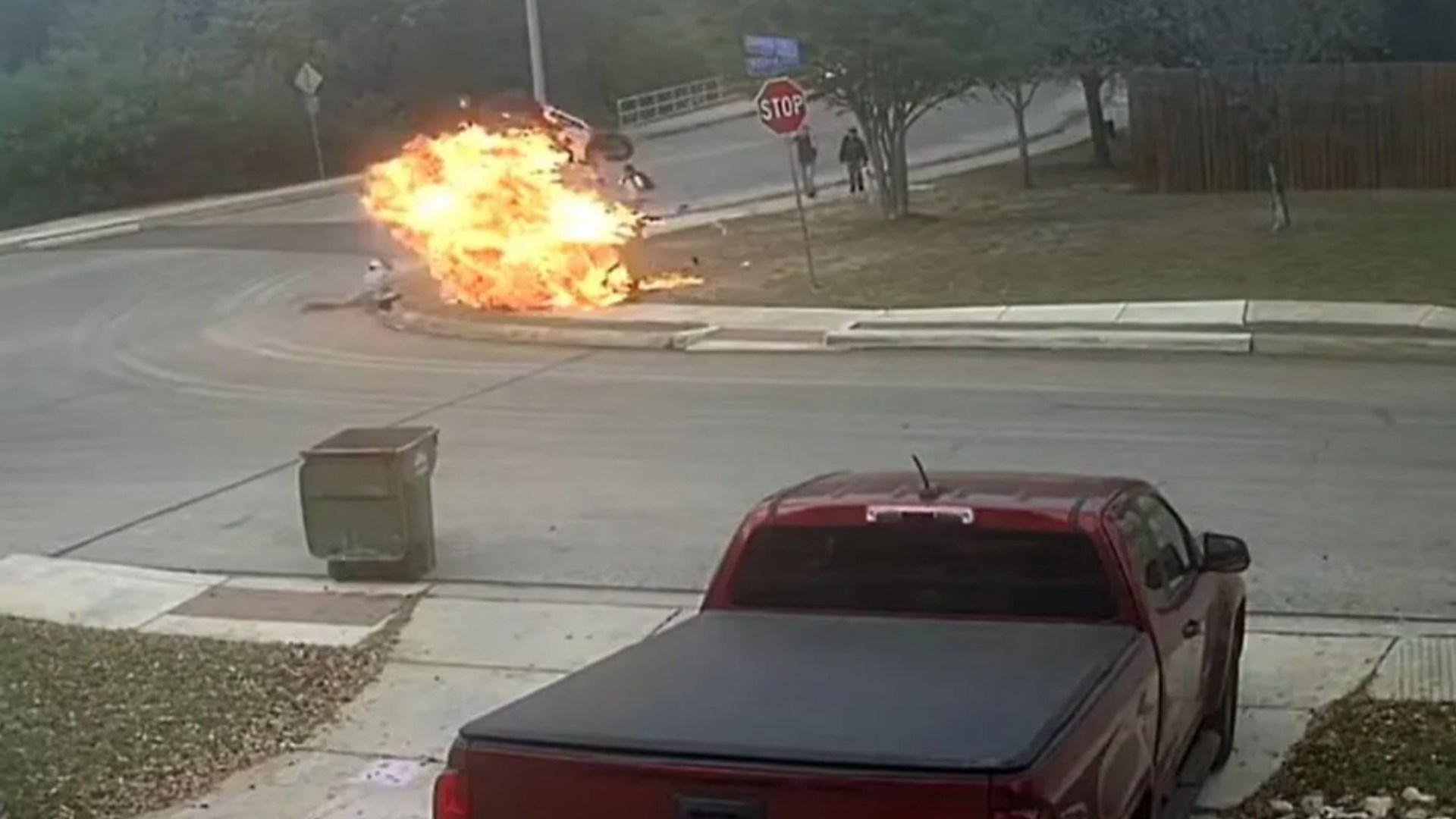 The motorbike burst into flames after hitting the kerb in a Texas neighbourhood.