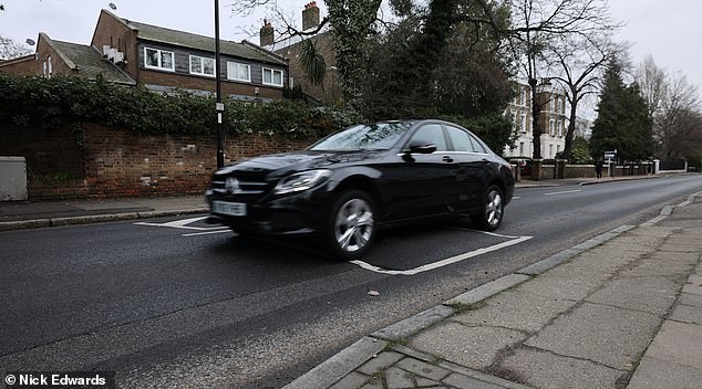 Five of the 12 cushions measured appeared to be between 100mm and 105mm high, the survey alleged. A car is pictured mounting one of the speed bumps on the Lewisham street