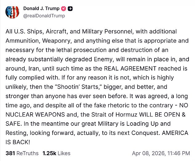 ‘All US Ships, Aircraft, and Military Personnel, with additional Ammunition, Weaponry and anything else that is appropriate and necessary for the lethal persecution and destruction of an already substantially degraded Enemy, will remain in place in, and around, Iran, until such time as the REAL AGREEMENT is fully complied with,’ he wrote in a Truth Social post late Wednesday night.