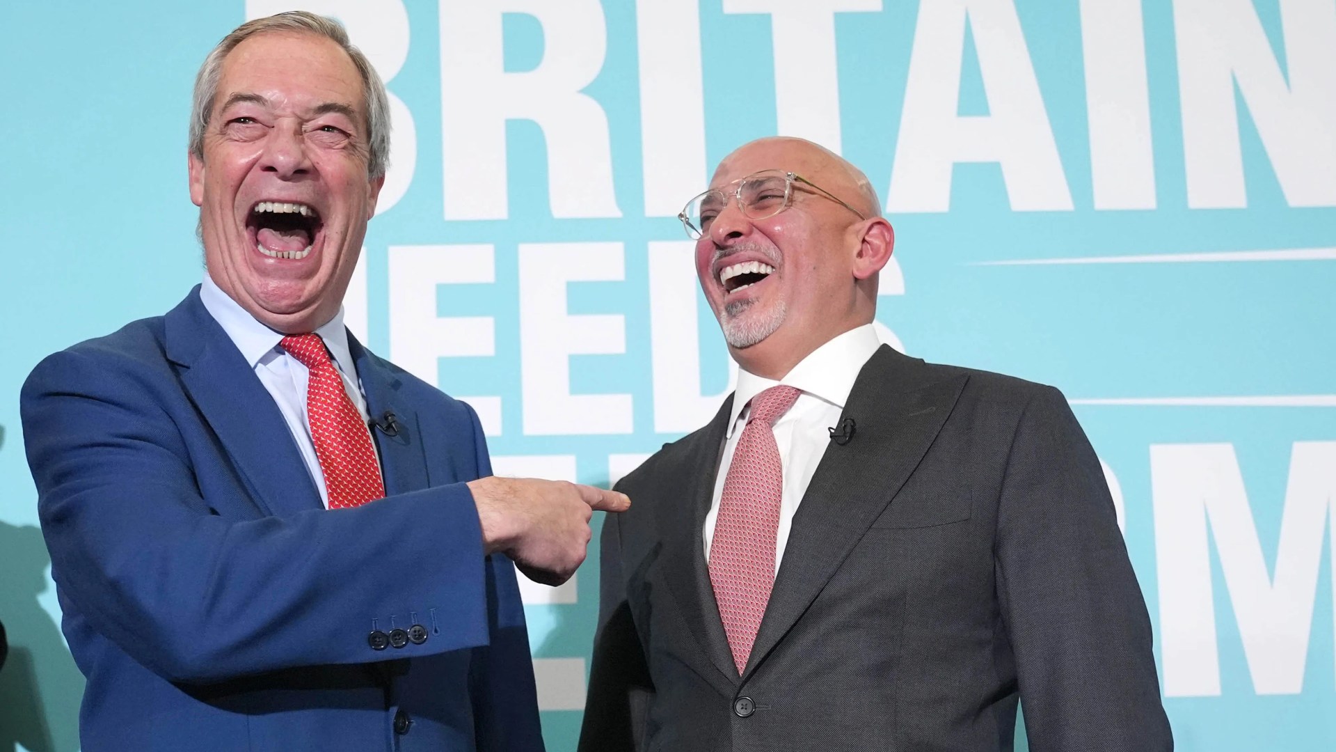 Nigel Farage and Nadhim Zahawi laughing at a Reform UK press conference.