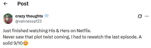 Another added: ‘Just finished watching His & Hers on Netflix.