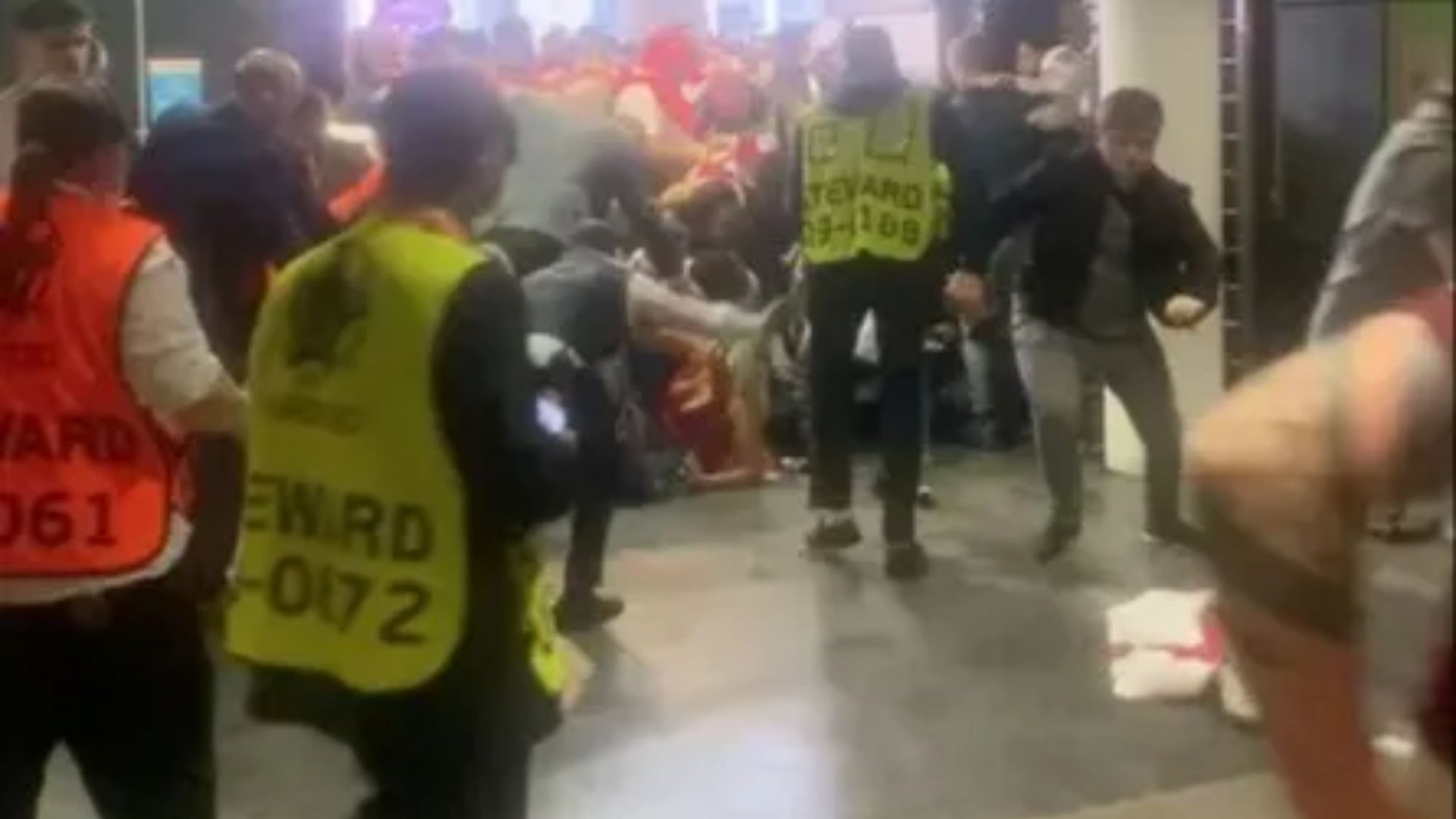 Video grab shows fans attempting to get through a door meant for disabled access at Wembley Stadium.