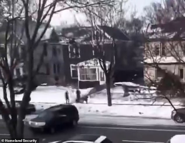 Ross (pictured to the left of the SUV) is seen holding his pistol up as the vehicle drives off