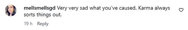‘Very very sad what you have caused. Karma always sorts things out.’
