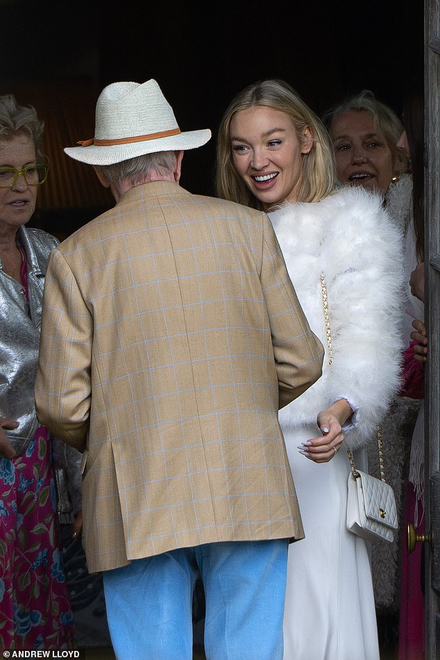 On Sunday the model, 34, emerged from the 17th-century Euridge Manor in the Cotswolds looking stunning in a feathered white jacket layered over a slinky dress and accessorised with a white Chanel bag.