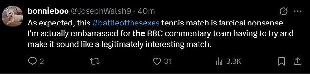 A third wrote: ‘As expected, this #battleofthesexes tennis match is farcical nonsense. I’m actually embarrassed for the BBC commentary team having to try and make it sound like a legitimately interesting match.’