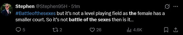 Another added: ‘But it’s not a level playing field as the female has a smaller court. So it’s not battle of the sexes then is it…’