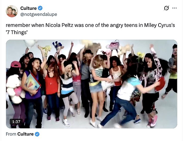 The clip started going viral after a fan shared it with the caption: ‘remember when Nicola Peltz was one of the angry teens in Miley Cyrus’s ‘7 Things’.’