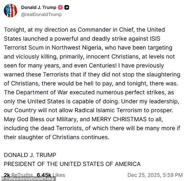 Trump announced the ‘powerful and deadly’ strike on ISIS ‘terrorist scum’ in Nigeria on Christmas Day, and warned that radicals will continue to pay for the persecution of Christians.