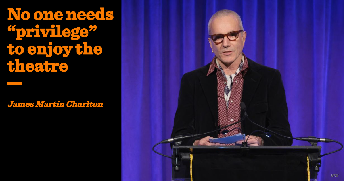 He then makes an irritating claim. Theatre, he states, is an exclusive cultural institution which “essentially relies on people having had the privilege of an education that allows them to believe that they’re entitled to go to the theatre … It’s a relatively small group of people that is available to, and that is just quite wrong.”