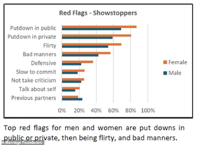 The study for the Marriage Foundation thinktank asked more than 2,000 British adults aged 18-35 what they look for in a partner (green flags) and what are their biggest turn-offs (red flags).