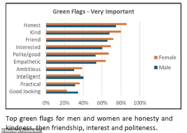 By contrast, just 23 per cent of men and 35 per cent of women gave ‘looks’ as a green flag.