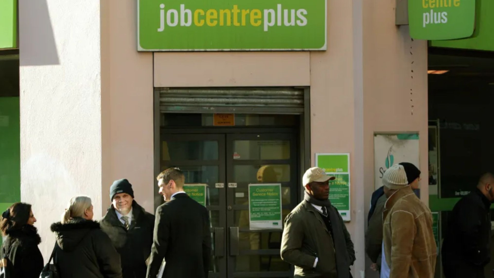 An image collage containing 1 images, Image 1 shows People waiting outside a Jobcentre Plus unemployment office