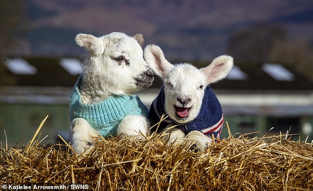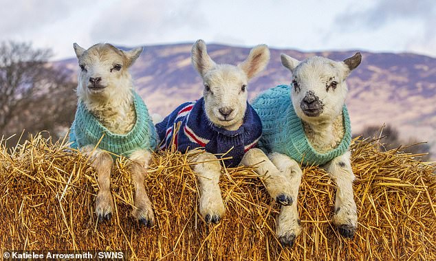 Adorable photos show the baby sheep kitted out in jumpers knitted by volunteers.