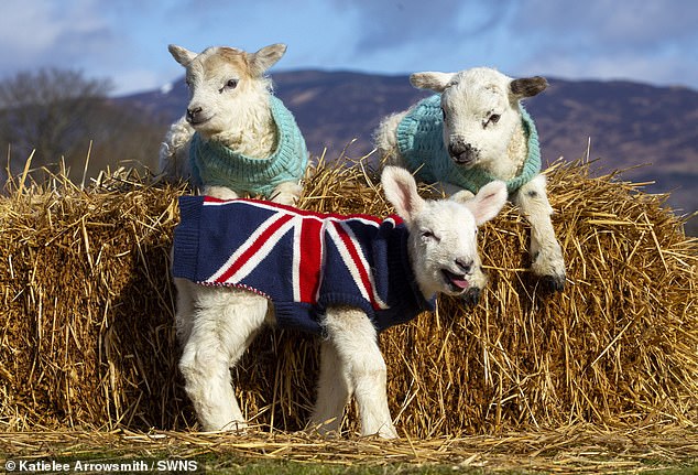 Adorable photos show lambs in jumpers knitted by volunteers, with Jackie getting a smart Union Jack pullover this year