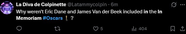 Another wrote, ‘Why weren’t Eric Dane and James Van Der Beek included in the In Memoriam #Oscars.’