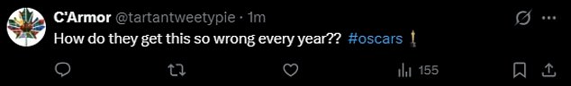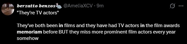 An X user added, ‘”They’re TV actors.” They’ve both been in films and they have had TV actors in the film awards memoriam before BUT they miss more prominent film actors every year somehow.’