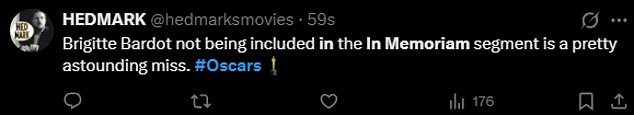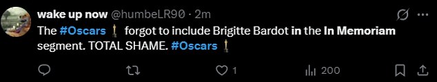 A fan said, ‘The #Oscars forgot to include Brigitte Bardot in the In Memoriam segment. TOTAL SHAME.’
