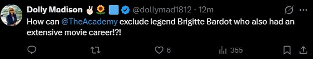 ‘How can @TheAcademy exclude legend Brigitte Bardot who also had an extensive movie career!?! a social media user penned.