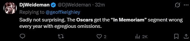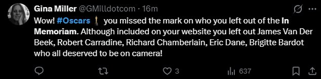 One added, ‘Wow! #Oscars you missed the mark on who you left out of the In Memoriam.