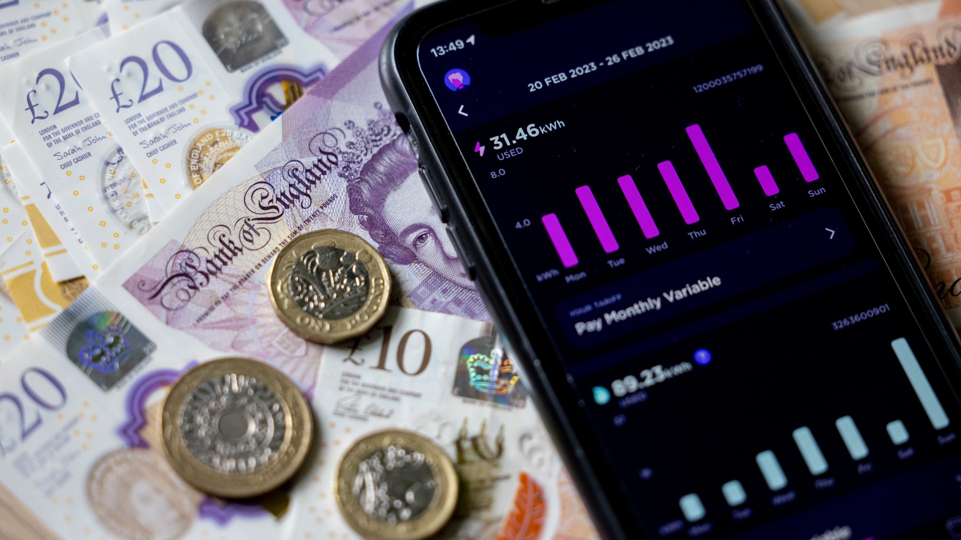 A smartphone displaying an energy usage app with British currency underneath, illustrating rising energy costs.