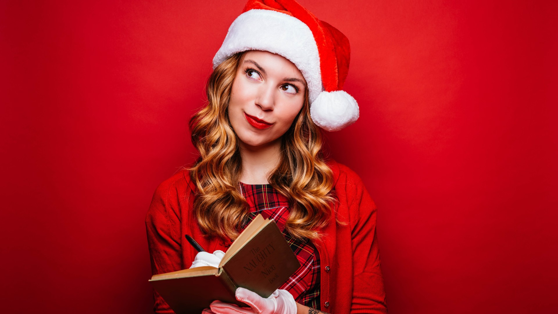 Collage of a woman in a Santa hat writing in a book, a messy desk with a champagne bottle, a couple arguing, and a man looking at his phone.
