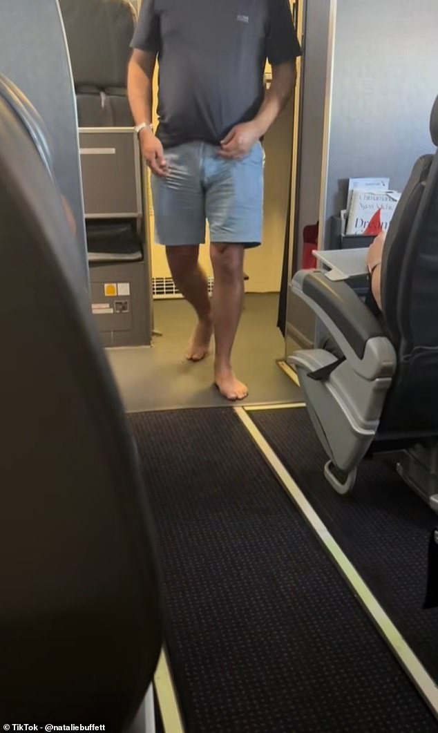 Natalie Buffett, who goes by @nataliebuffett on TikTok, shared an eight-second clip to her page in July, which briefly captured a male passenger - without socks or shoes - exiting the restroom at the front of the plane