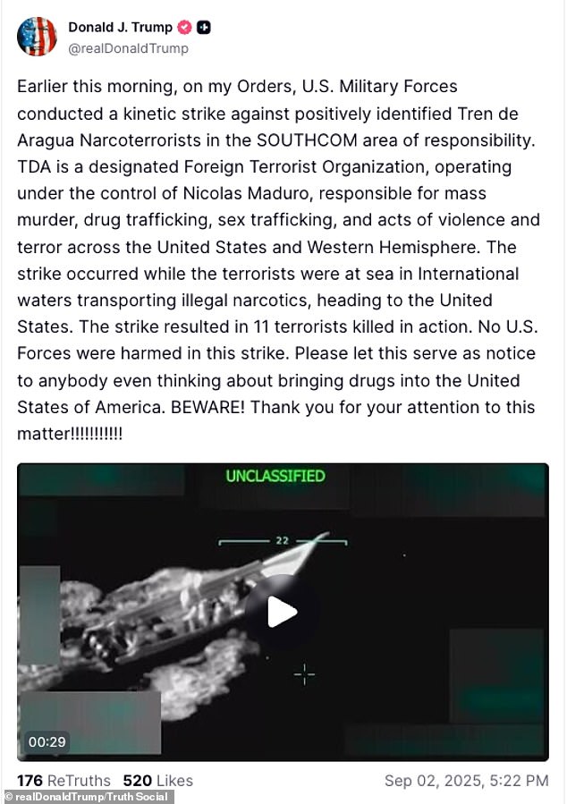 The Trump administration has argued that its attacks are legal because the president is ‘determined’ the United States is in an armed conflict with those he calls narcoterrorists