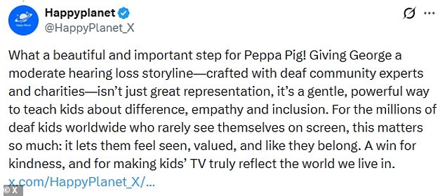 Further praise came from users writing: ‘What a beautiful and important step for Peppa Pig! Giving George a moderate hearing loss storyline—crafted with deaf community experts and charities—isn’t just great representation…
