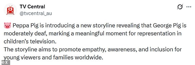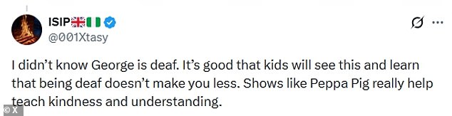 One user penned: ‘This is important, honestly. A lot of kids watch Peppa Pig every day. Seeing George as deaf will help children understand that being different is normal. It also helps kids with hearing issues feel seen and not alone…