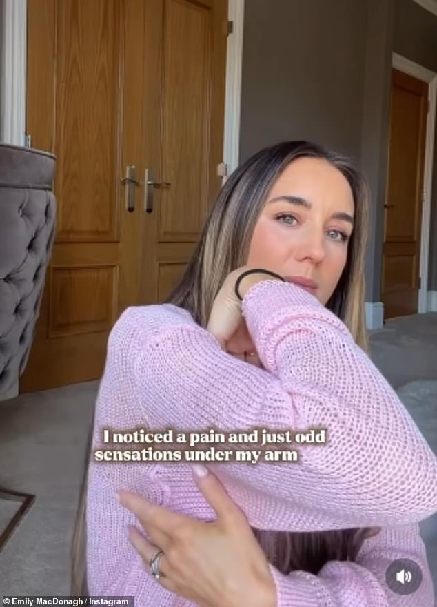 Wearing a pink woolen jumper, she then said in her video: ‘I noticed a pain and just odd sensations under my arm here and then a couple of days later the rash appeared on my back on one side.’