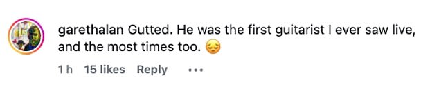 Devastated fans were quick to share their condolences, writing: ‘Gutted. He was the first guitarist I ever saw live, and the most times too’