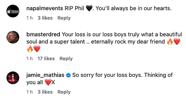 ‘Really sorry to read this…Condolences to you and your extended families lads. Rest well Phil’: ‘our loss is our loss boys truly what a beautiful soul and a super talent .. eternally rock my dear friend’: ‘The greatest Welsh guitarist ever.’