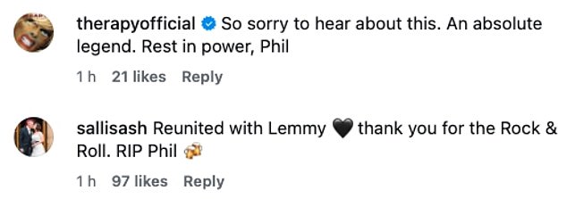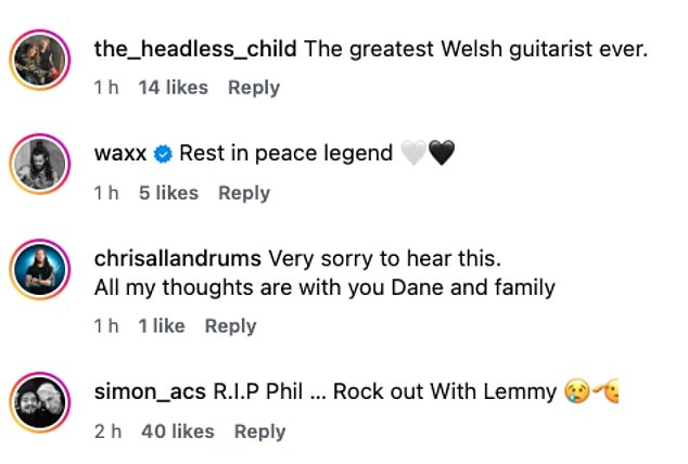Devastated fans were quick to share their condolences, writing: ‘Gutted. He was the first guitarist I ever saw live, and the most times too’: ‘So sorry to hear about this. An absolute legend. Rest in power, Phil’: ‘Reunited with Lemmy. Thank you for the Rock & Roll. RIP Phil’.