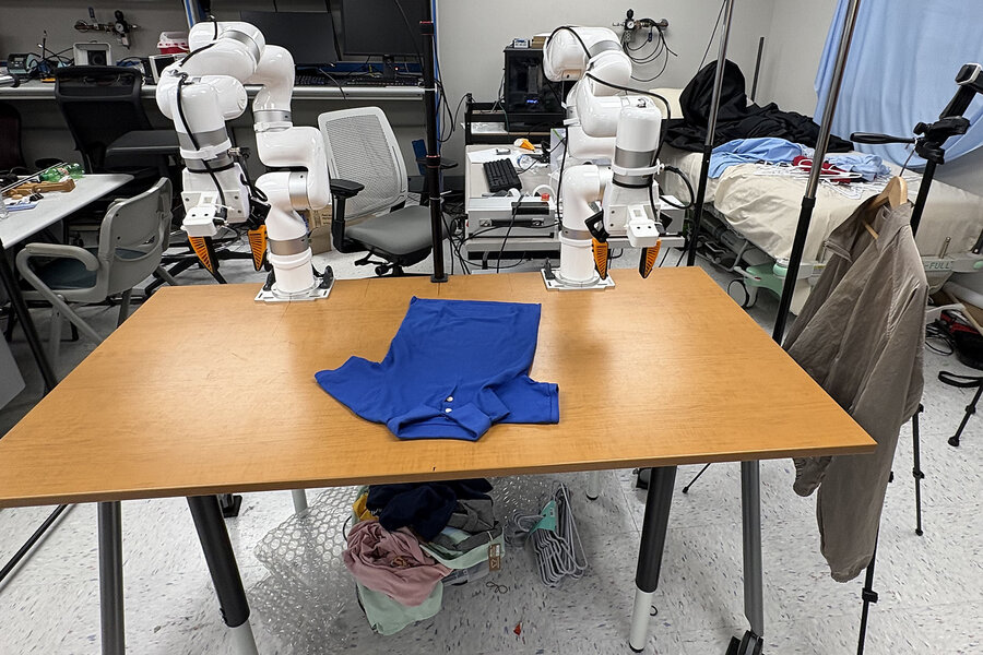 At Carnegie Mellon University’s Robotics Institute, robots are being trained to use artificial intelligence to do everyday tasks. One curvy, tubelike robot with a claw for a hand is learning how to hang clothes. Another is being trained to help people get dressed – it can grab onto a sleeve and pull it up a person’s arm.