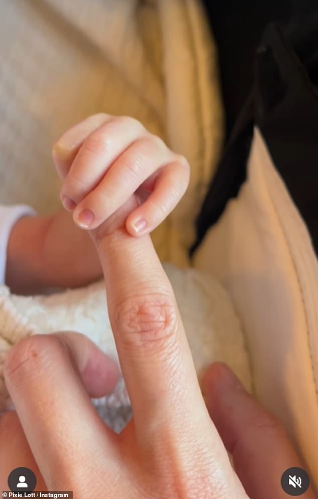 Uploading a sweet video of the baby gripping her finger she penned: ‘he’s here’