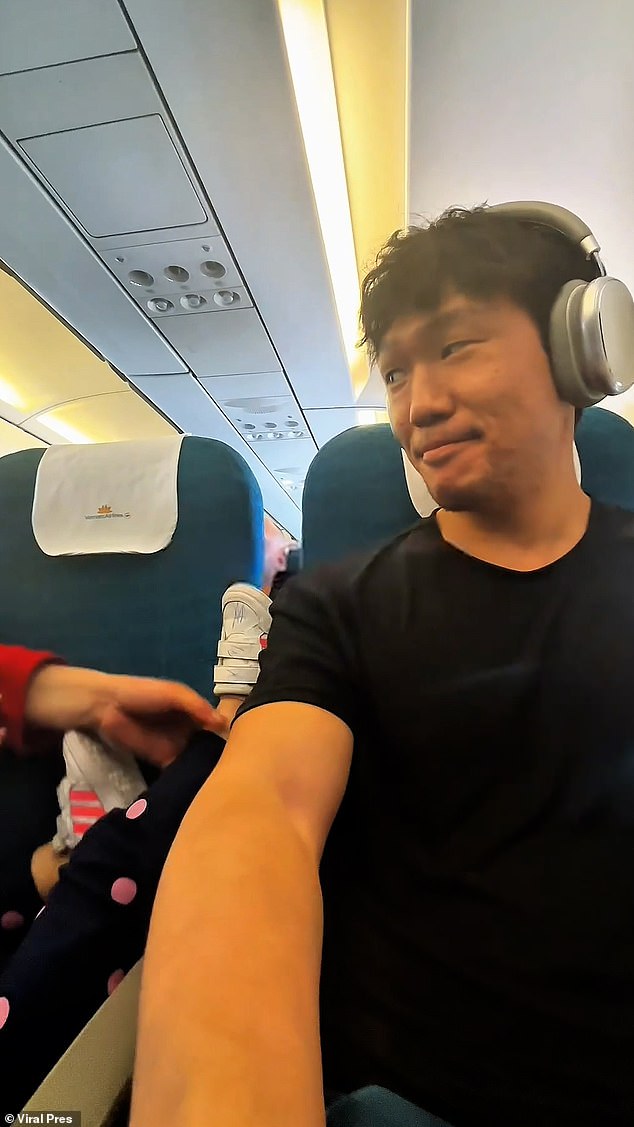 Throughout the video, the content creator maintained his calm, but later uploaded the footage alongside a caption that read: ‘Worst possible seat ever next to a crying baby.’