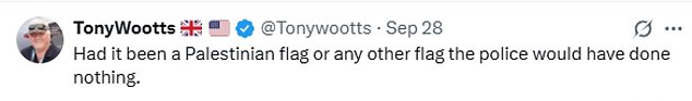 Responding to the video on X, one user wrote: ‘But don’t you dare fly the English flag or Union Jack!!!! Two tier policing is alive and well throughout the UK.’