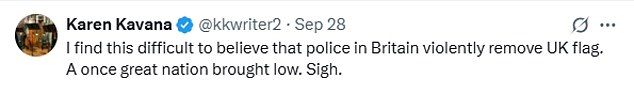 ‘I find this difficult to believe that police in Britain violently remove UK flag. A once great nation brought low. Sigh,’ another wrote.
