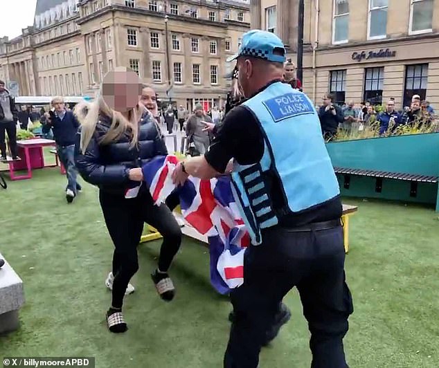 In a statement, Northumbria Police said: ‘We are aware of video clips circulating online in relation to an officer removing a flag from someone during protest activity in Newcastle on Saturday (August 27).
