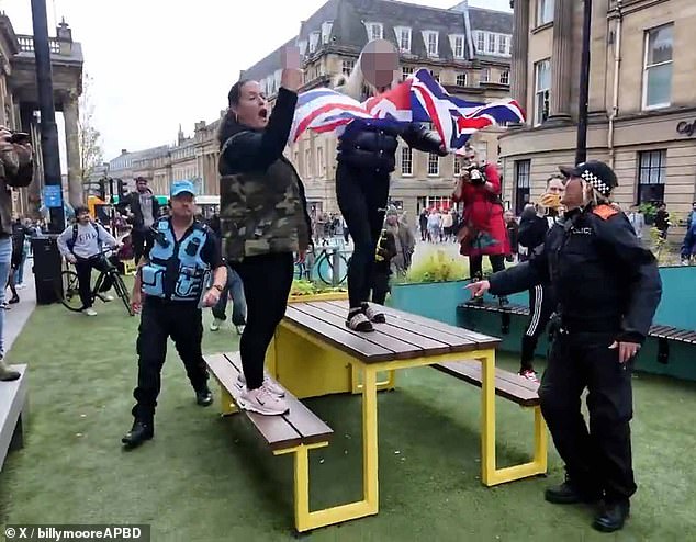 Footage shows the teenager standing on a table proudly waving the flag in front of a group of counter protestors, as a female officer tried to speak to her before a male colleague intervened by swooping in and grabbing the flag.