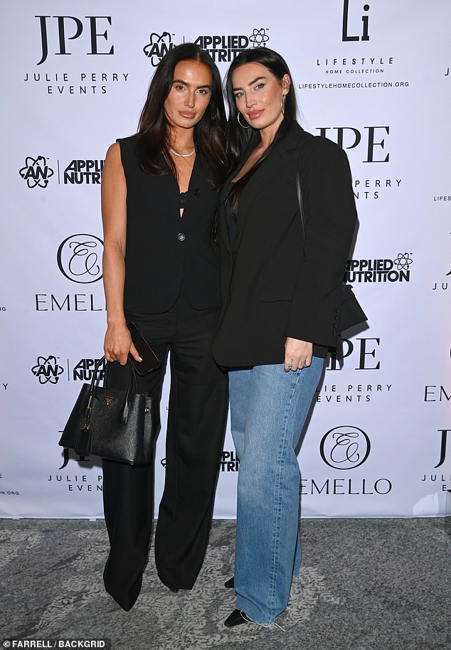 Meanwhile her sister cut a stylish figure as she flashed a black laced bra underneath a dark sleeveless vest and matching wide-leg trousers.