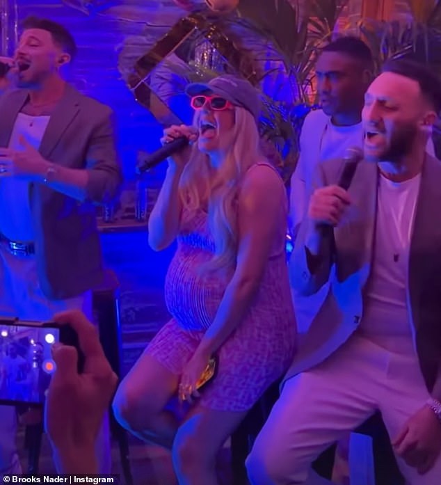 She captioned the snap: ‘Don’t temp me with a theme!! Palm Royale takes London’ before posting a clip of Ellie’s impromptu perfomance saying: ‘Don’t bother inviting me to a baby shower if it ain’t this fun’.