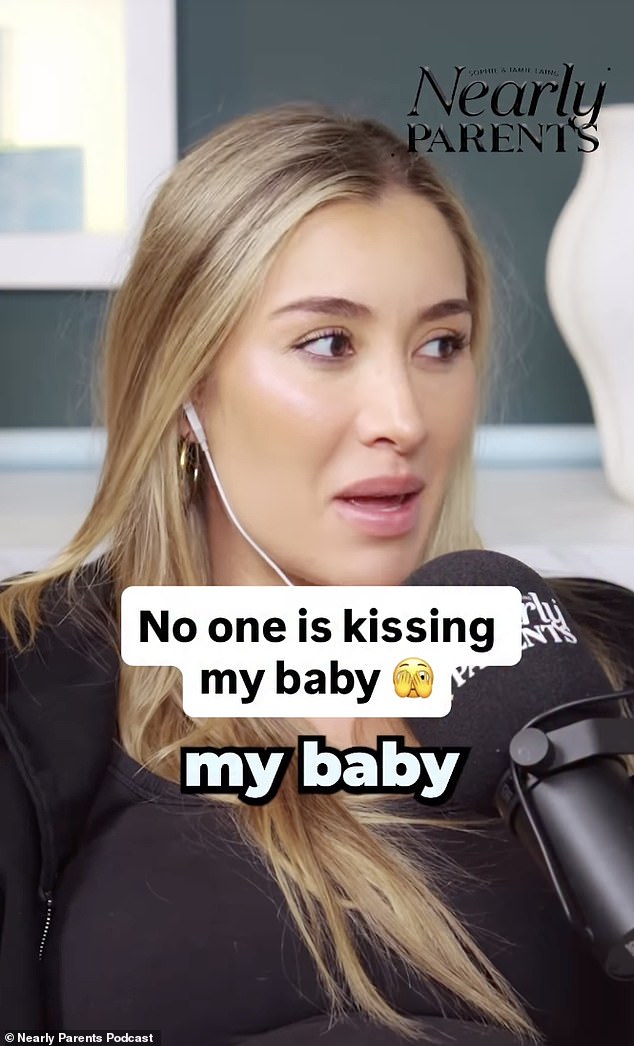Speaking on their Nearly Parents podcast, Sophie said: ‘No one’s f*****g kissing my baby. And I’m gonna say this on this podcast: If anyone comes and kisses my newborn baby, I will punch you in the face.