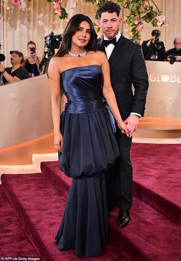 The Bollywood A-lister clung amorously to her besuited husband, 33, who once won a Golden Globe for a song called Home that he wrote for the animated movie Ferdinand