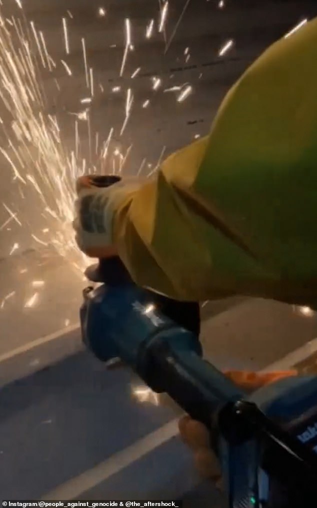 Videos posted by the group show a group of protesters clad in yellow jump suits, gloves and hard hats cutting into large sections of the metal sheeting on the roof with electric saws, as sparks fly around them.